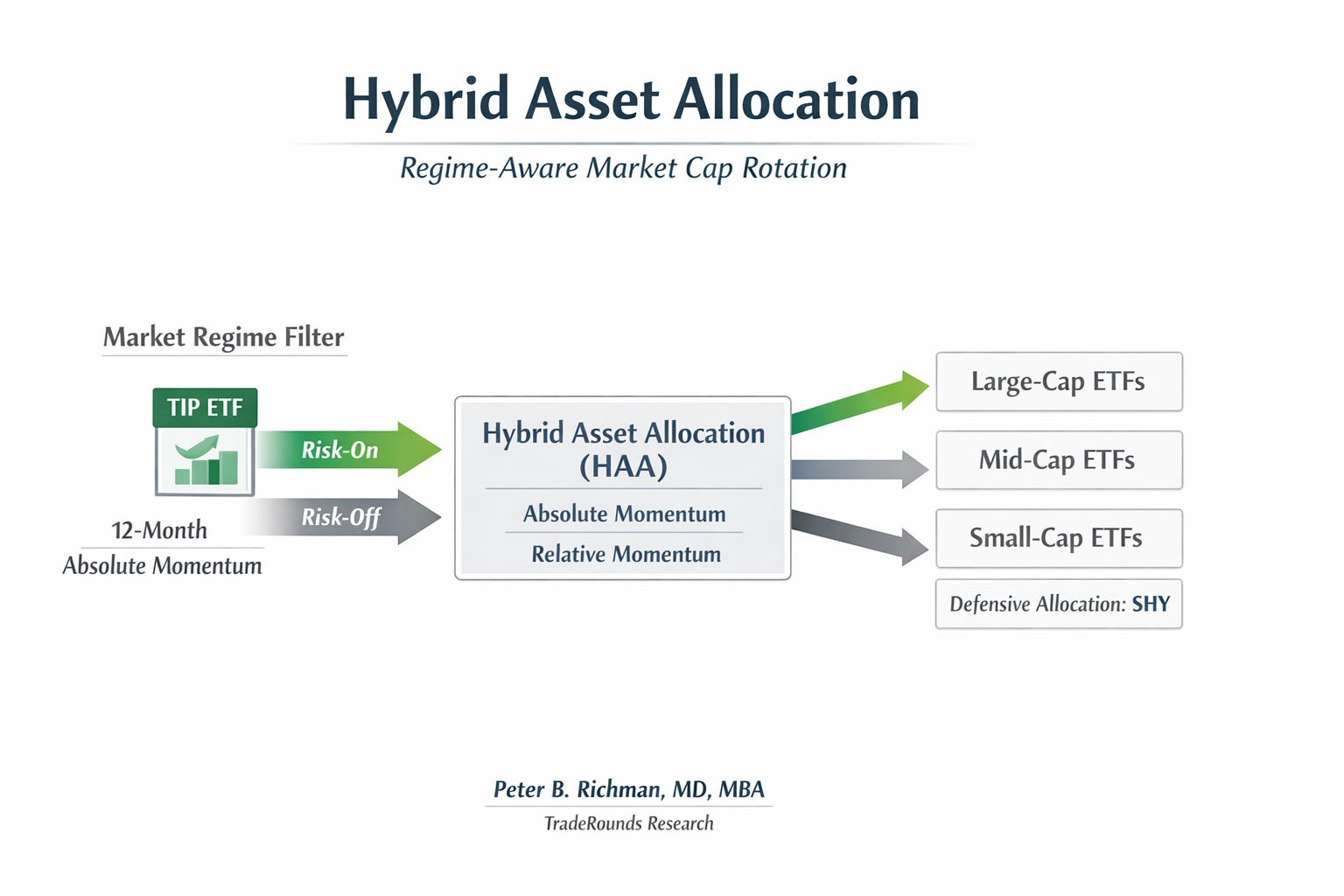 Keywords: Hybrid Asset Allocation, Market Cap Rotation, Regime-Aware Investing, Tactical Asset Allocation, Absolute Momentum, Relative Momentum, ETF Rotation