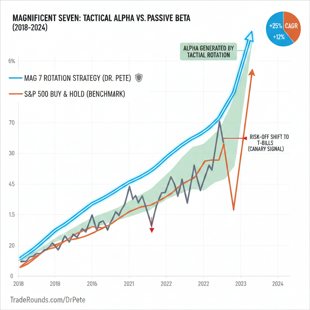 Enhanced Alpha: By rotating into the Mag 7 only during periods of confirmed relative strength, the strategy significantly outperformed a static “buy and hold” approach to the S&P 500.