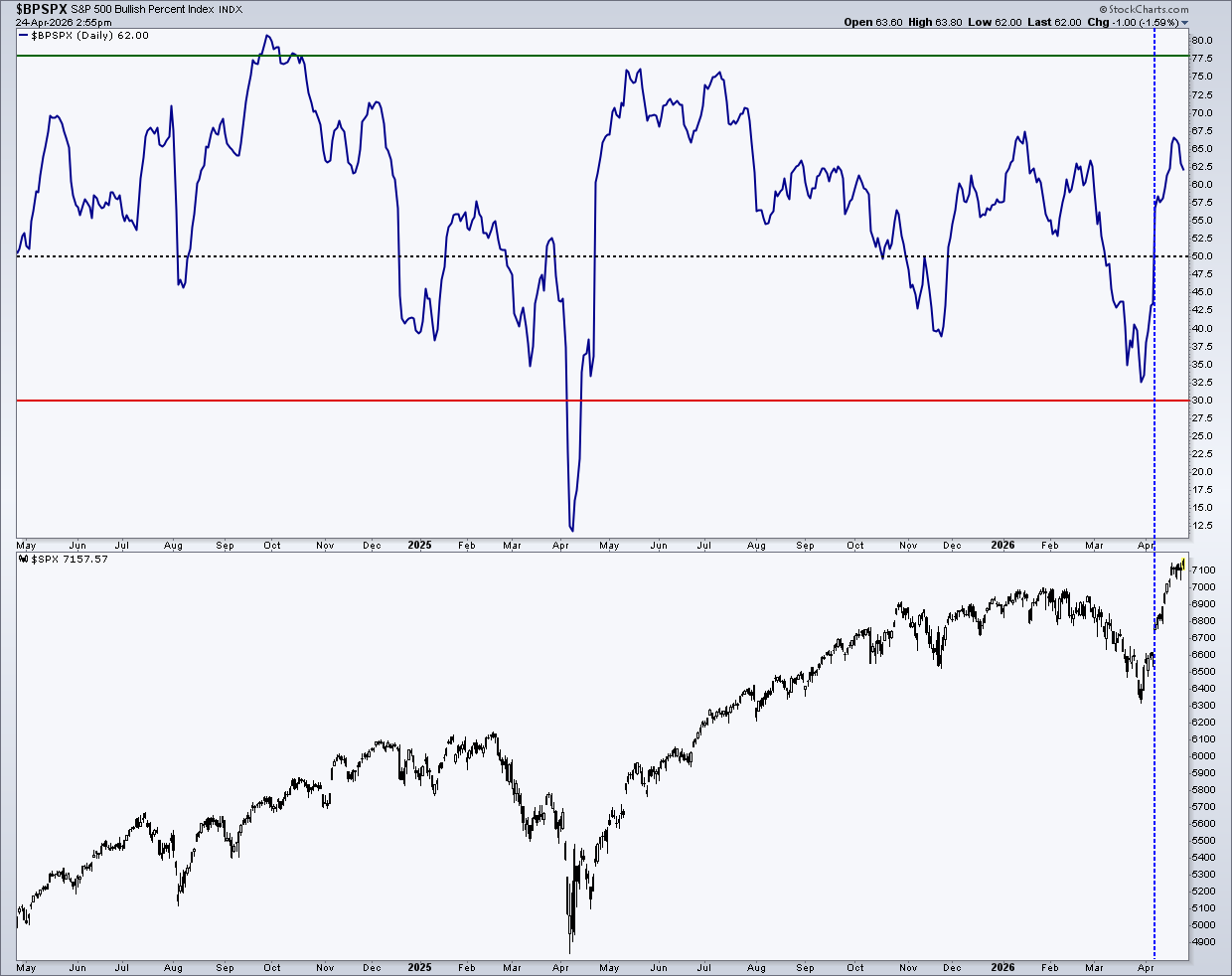 The chart provided by StockCharts below illustrates the critical relationship between the $BPSPX and the S&P 500 ($SPX) through late April 2026, it highlights how breadth serves as a confirming indicator during periods of volatility.